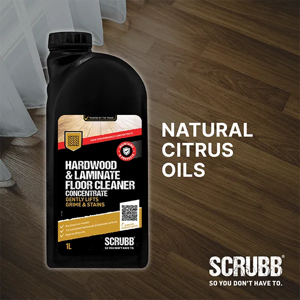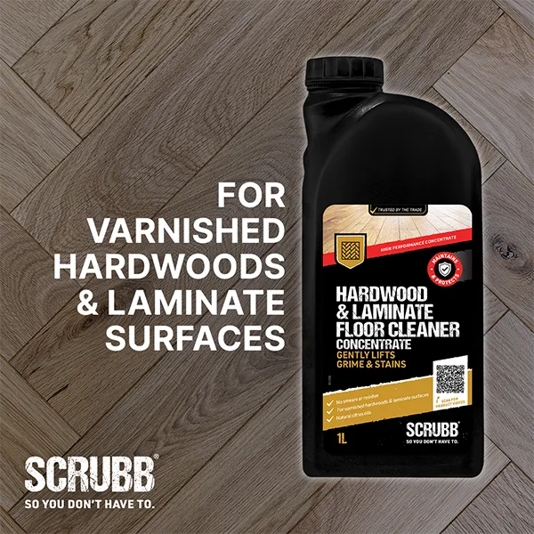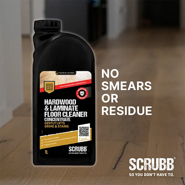 SCRUBB Hardwood & Laminate Floor Cleaner Concentrate has been formulated for the care and maintenance of laminate and finished hardwood flooring. Its advanced low-residue formulation cleans without leaving streaks or smears. Suitable for use on all laminate floors and surfaces, and on hardwood floors with a varnish, acrylic or polyurethane finish. Do not use on waxed or oil-finished wood surfaces.