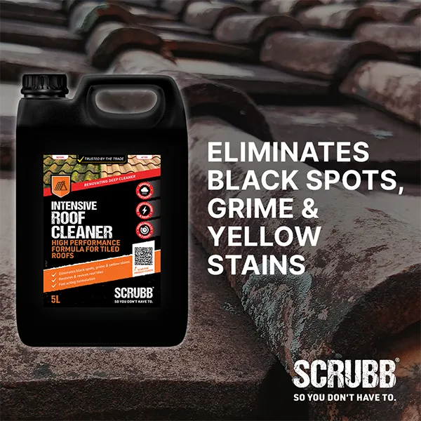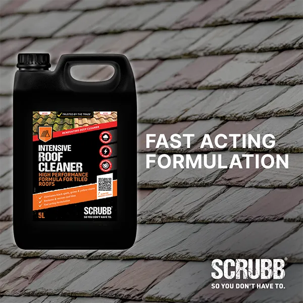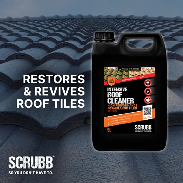 SCRUBB Intensive Roof Cleaner powers away green growth, lichen, black spots, algae and atmospheric grime from roof tiles, deeply cleaning and rejuvenating to lift the appearance of any property. Acid-free and suitable for use on all tile types including slate and natural stone, clay and concrete.